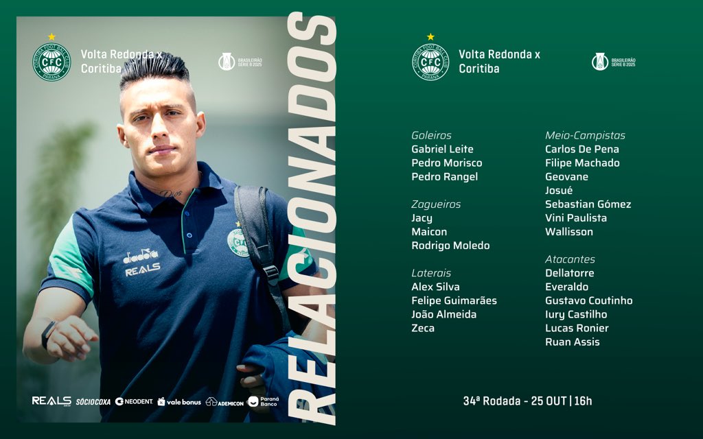 É amigos, a luta alviverde pelo acesso segue na série B. Neste sábado (25), às 16h, o Coritiba enfrenta o Volta Redonda, no estádio Raulino de Oliveira, pela 34ª rodada da competição. Na ponta da tabela, o Cori precisa vencer para seguir líder e, de quebra, ficar cada vez mais próximo do acesso à série A. A partida terá a transmissão dos canais ESPN, Disney + e RedeTV, além do canal do Desimpedidos no Youtube.